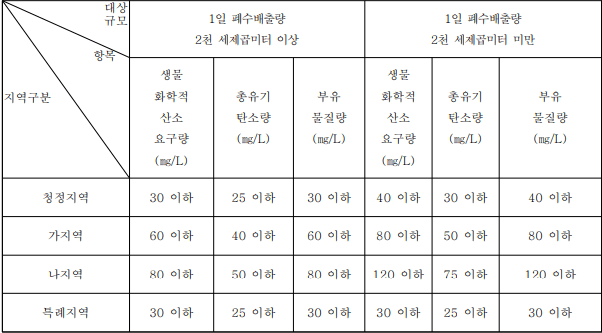 수질오염물질의 배출허용기준은 지역에 따라 다음과 같이 분류됩니다.